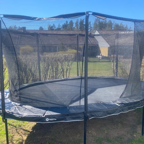 Nätet har revor på två ställen men är lagbart. Det finns att köpa utbytes o h reparations-kit hos Trampolinspecialisten.