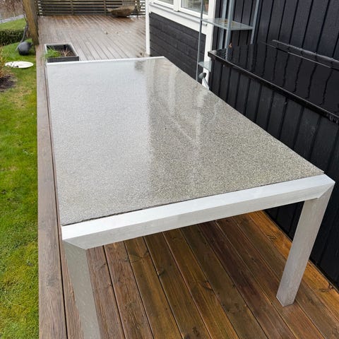 Bordet är gjort av längsgående ribbor med kryssben i metall. Passar som matbord eller avlastningsbord utomhus på altan eller i trädgård.