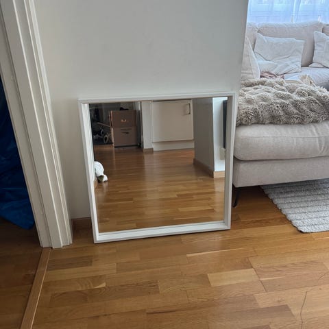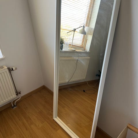 IKEA spegel med klädhängare i vit metall. Fristående helkroppsspegel med smal, rektangulär spegelyta. Baksidan har krokar och stänger för upphängning av kläder och accessoarer. Stativ i metall med golvstöd som ger stabilitet. Passar i sovrum, hall eller klädkammare för spegling och förvaring av kläder.