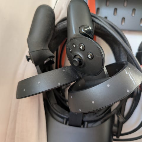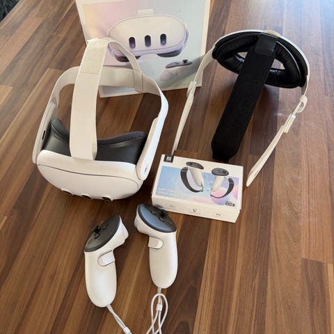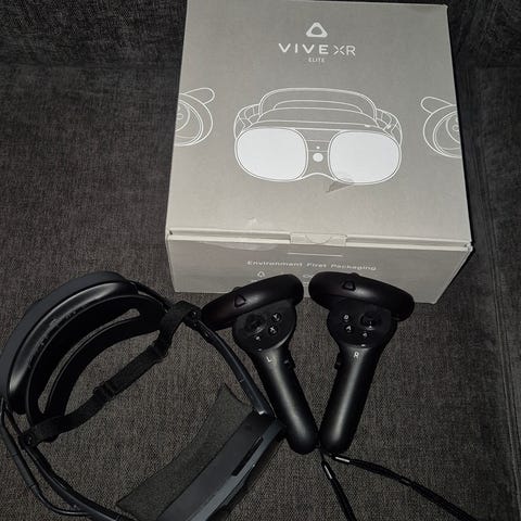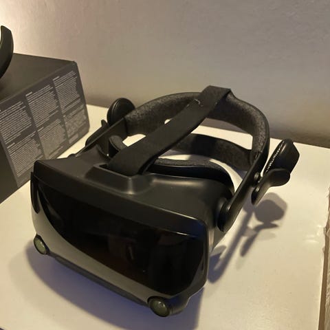 Valve Index VR-headset med tillhörande kontroller och basstationer. Satsen inkluderar VR-headset, två handkontroller, basstationer för rumsskalig spårning samt kablar och övriga anslutningar som hör till systemet. Systemet är avsett för användning med kompatibel dator och ger rörelsespårning i flera riktningar för VR-spel och andra virtuella upplevelser.