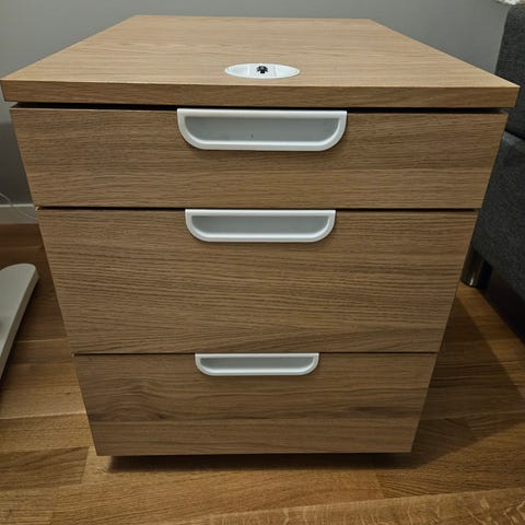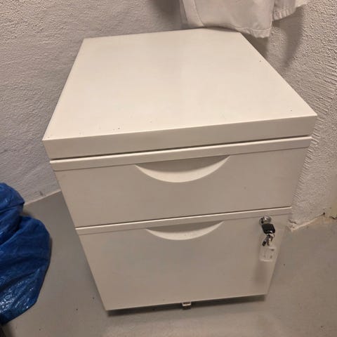 IKEA hurtskåp med lådor i vit färg. Skåpet har flera utdragbara lådor som passar för förvaring av kontorsmaterial, papper eller andra mindre saker i hemmet eller på kontoret. Ytan är slät med en synlig mindre skada upptill enligt bild. Möbeln är fristående och kan placeras intill skrivbord eller vägg för extra förvaringsutrymme. Den är lite vinglig men står stabilt mot en väg
