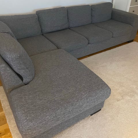 Ca 6-7 år gammal. 248x248 cm. Två nackstöd. Inga fläckar som sticker ut men finns säkert spår av användning om man synar den noga. Tror den heter Howard classic 6-sits och finns på bland annat chilli. Nypris runt 19.000 kr med nackstöden.