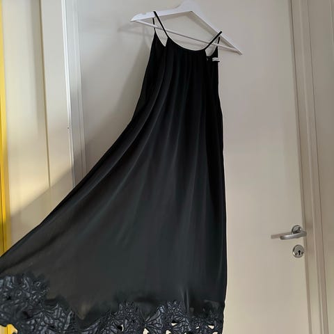 Svart mönstrad klänning med gröna blad. Knytband som kan knytas i ryggen eller i midjan beroende på vilken siluett man vill ha. V-ringad urringning, har 2 fickor i sidan.