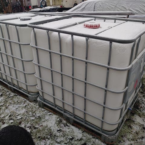 IBC-tank plastbehållare med metallbur. Rektangulär tank i vit plast omgiven av en skyddande metallbur och placerad på pallbotten. Övre öppning med skruvlock för påfyllning. Lämplig för förvaring och transport av vätskor. Passar för användning i trädgård, lantbruk, industri eller liknande där större volymer vätska behöver lagras eller flyttas.