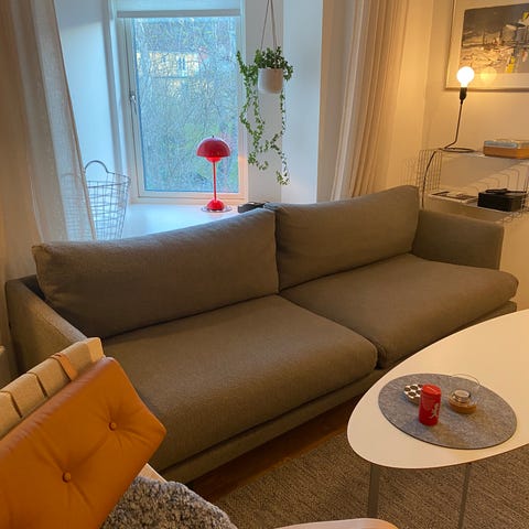 Tyget har synligt slitage och revor på vissa delar, vilket framgår av bilderna och därav priset. Man kan beställa gratisprover av tyget för att laga dom - vi har varit lata på den fronten. Finns en del fläckar från vardagsbruk (dvs inga värstingar) som garanterat går bort med möbeltvätt.