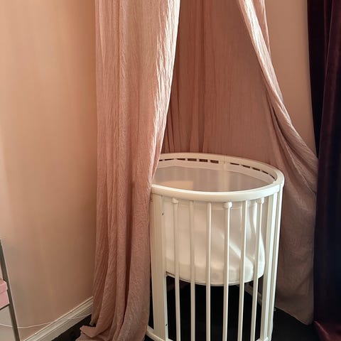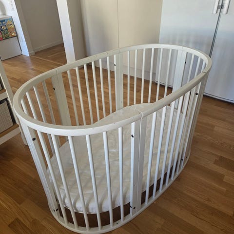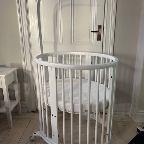 Stokke spjälsäng i vitlackerat trä. Sängen har rundad/oval form med ribbor runtom och står på hjul för enkel förflyttning. Madrass ingår enligt bild. Passar som sovplats för spädbarn och småbarn i barnrum eller sovrum.