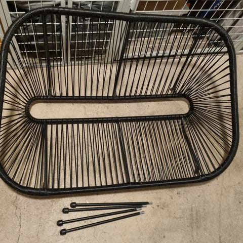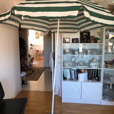 Om man vill ingår även parasollet (halvt för att kunna vara mot vägg) det är lite trasigt i toppen och snett rör, men med lite våld och vilja kommer parasollet upp.