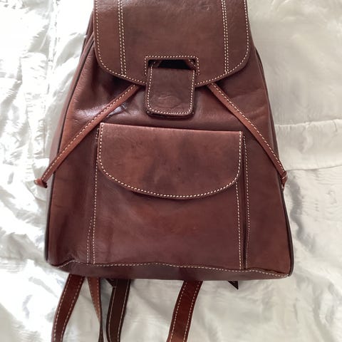 Axelremsväska i läder med justerbar axelrem. Väskan har ett huvudfack med dragkedja och flera mindre fack för organisering. Försluts med lock och spänne.