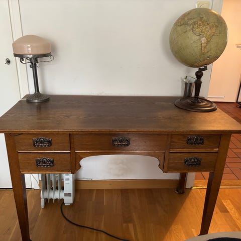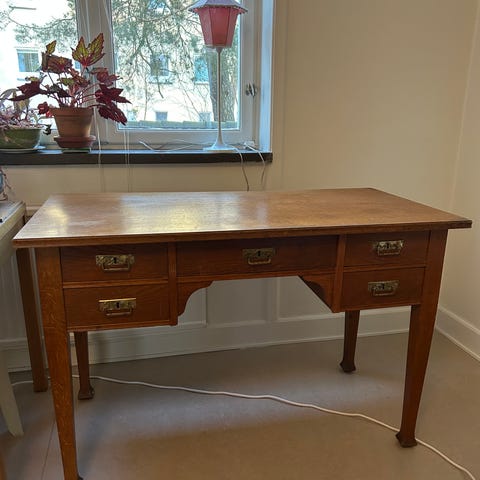 Avlastningsbord, mahogny, med två lådor framtill. Bordet har raka ben och dekorativa detaljer under bordsskivan. Passar exempelvis i hall, vardagsrum eller bakom soffa som avlastningsbord. Träytan visar synliga märken och slitage på bordsskivan enligt bild.