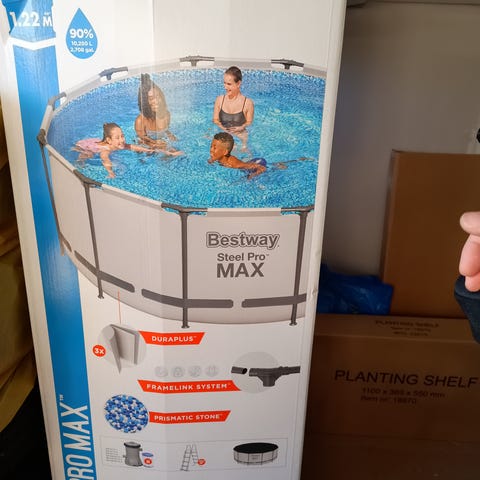 Bestway Steel Pro pool med stålram och duk i blå PVC. Rund ovanmarkspool med måtten cirka 457 x 91 cm (15' x 36"). Poolen levereras enligt kartongen med filterpump och patronfilter (typ II) samt nödvändiga slangar och kopplingar. Konstruktionen består av pulverlackerade stålrör och en slitstark liner. Avsedd för användning utomhus i trädgård eller på annan plan yta där pool får placeras. Lämplig för bad och lek för både barn och vuxna under uppsikt av vuxen.