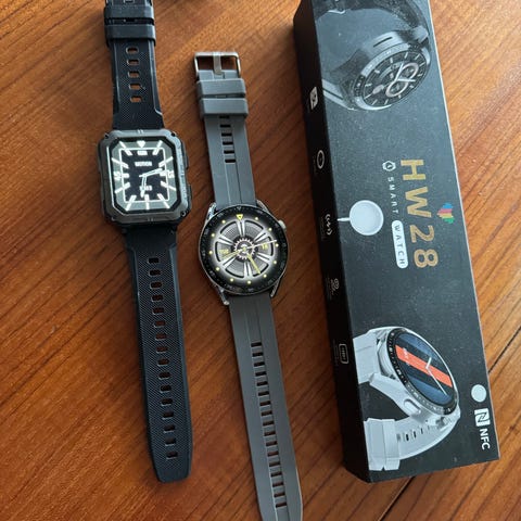 Armorwatch Pro X smartklocka i svart färg. Klockan har rektangulär pekskärm med färgdisplay och flera aktivitets- och statusindikatorer på urtavlan. I förpackningen ingår klockhus, svart armband och laddkabel med USB‑anslutning. Modellen är avsedd att bäras på handleden och kan användas av både dam och herr.