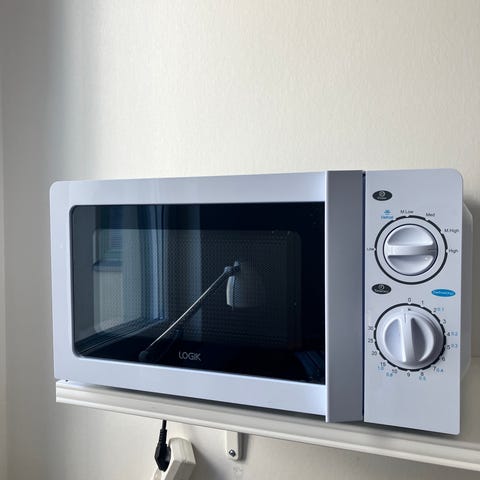 Logik mikrovågsugn i vit färg. Utrustad med roterande tallrik, digital display och vred för inställning av tid och effekt.