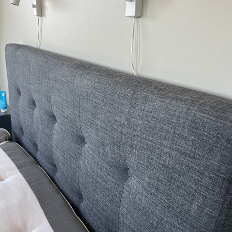 Sänggavel inköpt i sovabutik. Mörkgrå i fint skick.