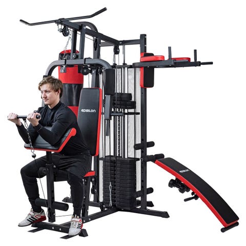 Weider Pro 5500 multigym i svart/röd färg. Maskinen har vadderat säte och ryggstöd samt armstöd i samma färgkombination. Stort viktmagasin med flera viktplattor som kan justeras med sprint för olika motståndsnivåer. Multigymmet är avsett för styrketräning i hemmet och möjliggör flera olika övningar för över- och underkropp, exempelvis latdrag, bröstpress och magövningar, enligt översikten på maskinens sida.