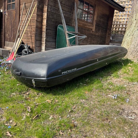 Packline 90, okänt årtal. Smuts på foton är mest gammal tejp som bör gå att ta bort. Saknar nyckel men går att låsas med mindre hänglås. Om så önskas så kan upphängningen i taket ingå. Väldigt bra om man har ont om plats. Saknar monteringssats för montage på takräcket.