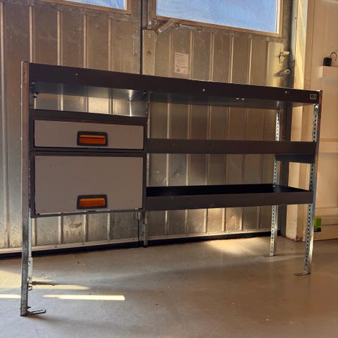 Bilinredning med hyllsystem och lådor i metall. Ca 250cm lång. Systemet består av flera öppna hyllplan samt tre utdragbara lådor monterade på sidan. Passar för montering i skåpbil eller transportbil för förvaring av verktyg, material och utrustning. Konstruktionen är i metall med perforerade sidostycken som kan användas för krokar eller tillbehör. Lämpligt för yrkesfordon där organiserad lastförvaring önskas.