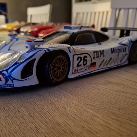 Mercedes-Benz CLK GTR modellbil i silver med detaljerad racingdekor och sponsorlogotyper. Bilen har fasta hjul, stor bakvinge och tydligt markerade karosslinjer. Passar som samlarobjekt eller prydnad och återger en tävlingsversion av Mercedes-Benz CLK i miniatyrform.