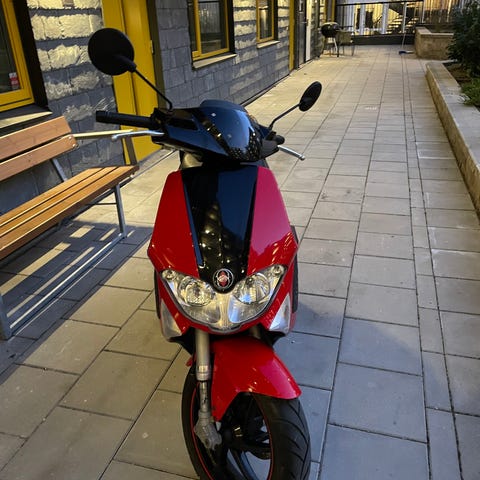 Baktill finns en toppbox/förvaringslåda. Fordonet är utrustat med backspeglar, strålkastare och blinkers. På karossen syns vissa repor och märken enligt bilderna.