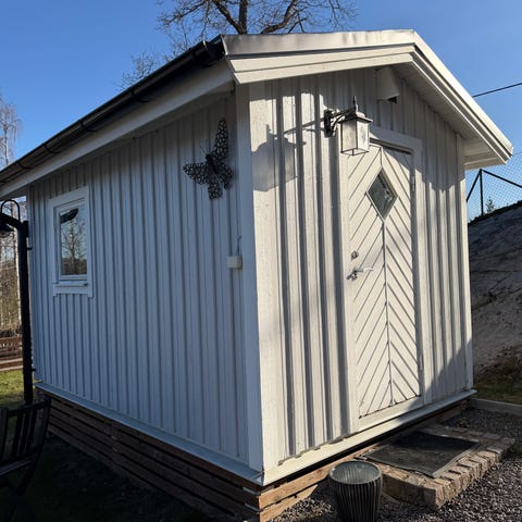 Fristående förråd friggebod i trä med svartmålad utsida. Byggnaden har sadeltak, en ytterdörr med glasruta samt två fönster som ger ljusinsläpp. Insidan är omålad träpanel med trägolv/laminat. Passar som förråd, hobbyrum eller enklare verkstad på tomten. Storleken framgår inte exakt av uppgifterna och behöver därför mätas på plats.