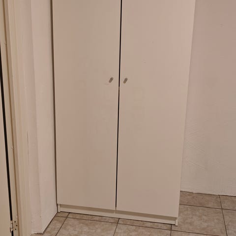 IKEA garderob i vit färg. Garderoben har två dörrar och två lådor på vänster sida samt öppna hyllplan på höger sida. Mått enligt bild: bredd ca 105 cm, djup ca 37 cm och höjd ca 140 cm. Passar för förvaring av kläder, skor och andra saker i sovrum, hall eller barnrum. Skåpet har en skada i ett av de övre hörnen, se bild för detaljer.