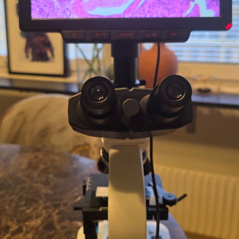 INF biologiskt mikroskop med binokulärt huvud. Mikroskopet har justerbart objektbord, grov- och finfokusering samt LED‑belysning (5 W) med nätanslutning 100–240 V, 50/60 Hz, utgång 7,5 V. På bilderna syns även en separat kameramodul och en transport-/förvaringsväska. Lämpligt för biologiska preparat och allmänna laboratorie- och utbildningsändamål.