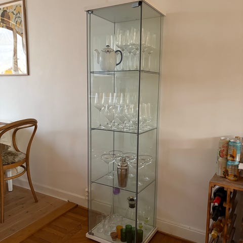 Vitrinskåp från IKEA med inbyggd belysning som ger en fin och stilren presentation av innehållet.