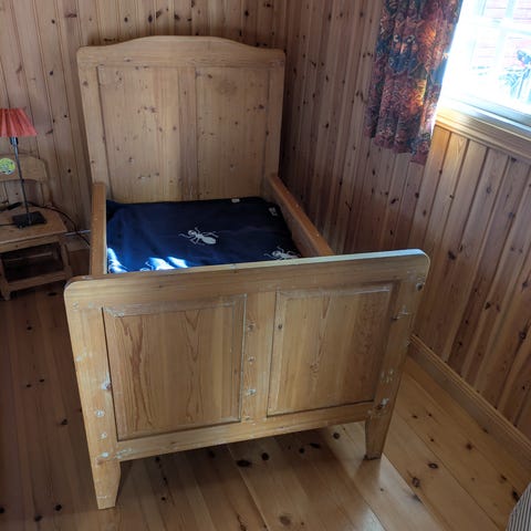 Säljer en fin och stabil förlängbar barnsäng i trä. Sängen har en söt ingraverad nallebjörn på båda sidor, vilket gör den extra charmig i barnrummet.