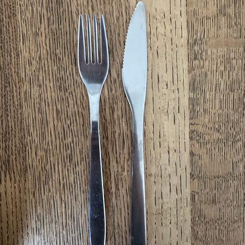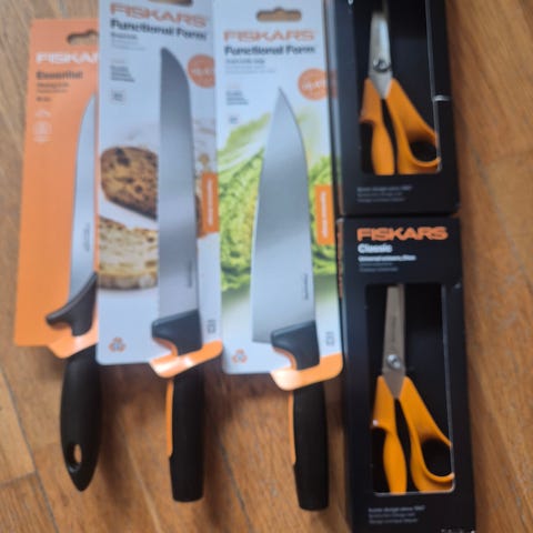 Fiskars knivset med fyra knivar. Setet innehåller: en skalkniv, en grönsakskniv, en fiskkniv, och en kockkniv.