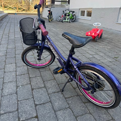 Utrustad med pakethållare bak,korg fram, skärmar, stöd,ringklocka och reflexer. Cykeln har fotbroms bak och handbroms fram.