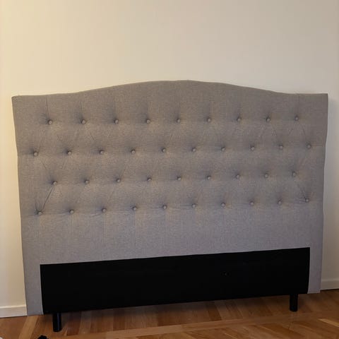 KungSängen sänggavel i ljusgrått tyg. Gaveln är vadderad och klädd i ett textilmaterial med knapptuftad framsida. Den står på ben i trä och är avsedd att placeras bakom en säng mot vägg. Passar som ryggstöd vid läsning eller vila i sängen och ger ett mjukt avslut mot väggen.