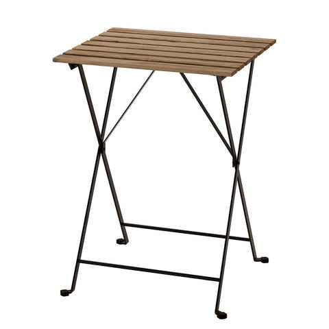 Grönt bord med tillhörande fällbara stolar i metall. Bordet har rektangulär skiva med tre längsgående sektioner och runda ben. Undersidan visar kryssförstärkt konstruktion i metall. Stolarna är hopfällbara med sits och rygg i samma gröna färg som bordet. Passar som extra matplats eller arbetsyta inomhus eller i skyddat uterum.