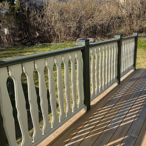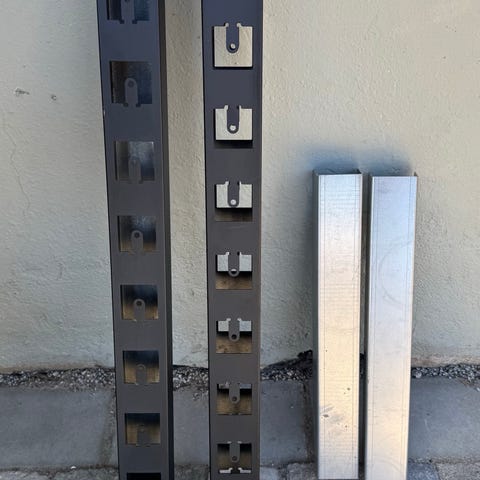 Fästen till skärmarna sitter kvar i stolparna . Har använts sommartid ett antal år och förvarats vintertid i uthus. De behöver spolas av och behandlas med tex olja.