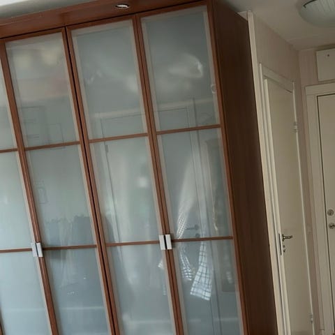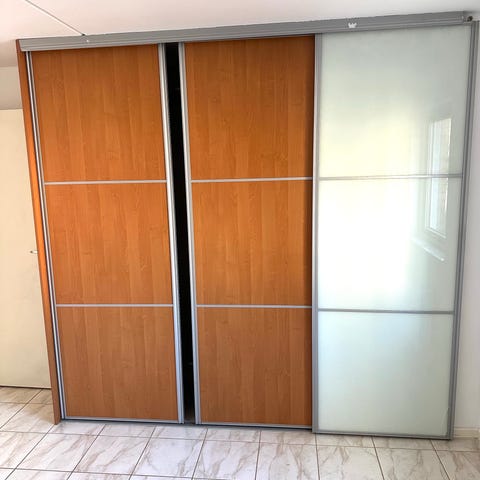 Garderoben har tre delar, men bara två visas på bilden; en del är fortfarande omonterad. Den omonterade delen är densamma som delen längst till höger.