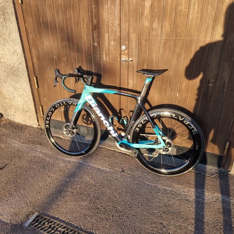 Full carbon italiensk aerohoj med elektroniska växlar. Cykeln är från 2017, men är sparsamt använd. Har cyklat en handfull turer de senaste tre säsongerna. Gissar att den har rullat totalt 3-400 mil (270 mil i min ägo).