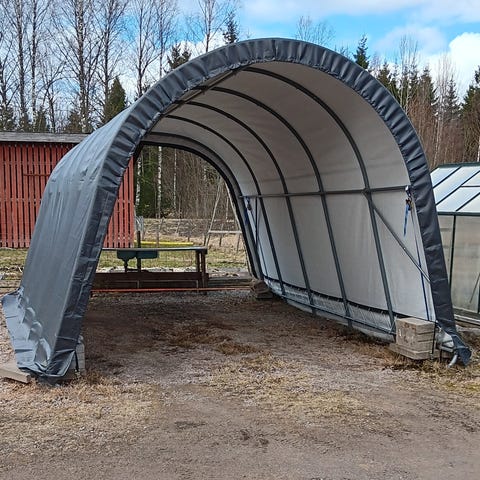 Dancover garagetält för bil i grönfärgTältet fungerar som ett skyddande garage för personbil och kan användas för förvaring och väderskydd utomhus. Konstruktionen är av tältmodell med öppning fram för enkel in- och utkörning av bilen. Mått 3,3x6x2,4 PVC