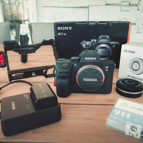 Jag säljer en Sony A7 V tillsammans med Sony FE 16–25mm f/2,8 G och en cage från SmallRig.