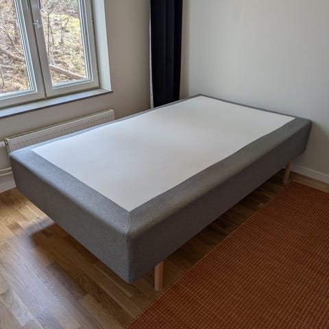 IKEA säng Stavanger med bäddmadrass. Sängen har mörk klädsel och står på metallben. 120cm.