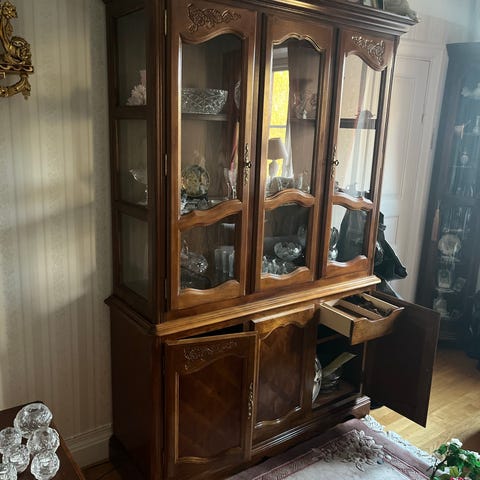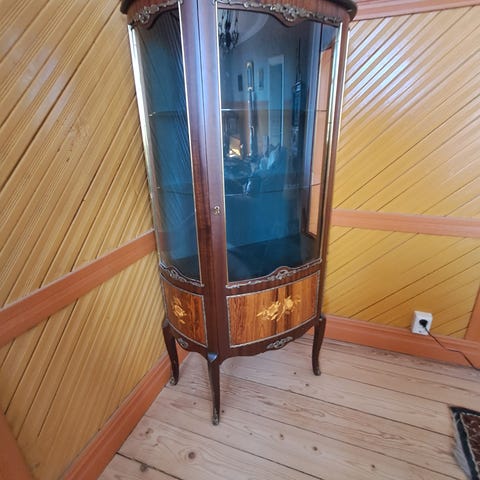 Vitrinskåp för hörnplacering i trä med glasdörrar och glasade sidor. Övre delen har hyllplan som passar för förvaring och exponering av glas, porslin eller böcker. Nedre delen har skåpsförvaring bakom trädörr samt en låda för mindre föremål. Passar i vardagsrum, matsal eller hall där man vill kombinera förvaring och display.