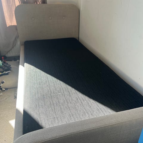 Mio säng med gavlar i svart tyg. Sängen har en hög, rak sänggavel och en liggyta anpassad för enkelsäng. Över madrassen ligger en vit bäddmadrass. Passar som enkelsäng i sovrum, gästrum eller tonårsrum.