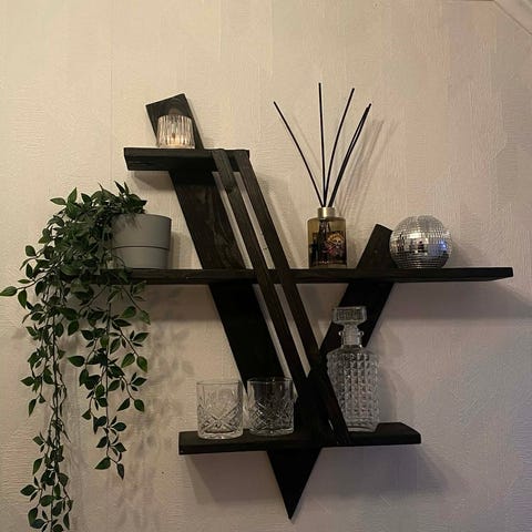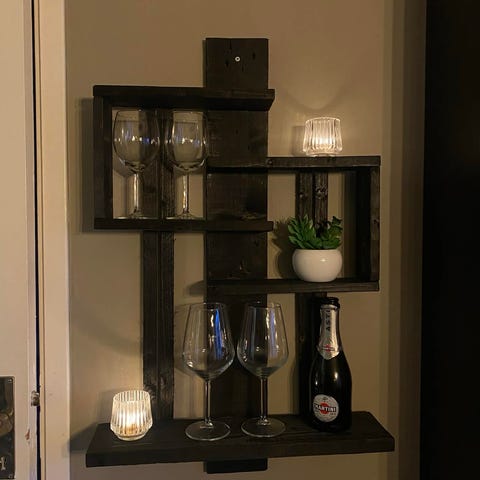 Vinhylla för väggmontering i svartmålat trä. Hyllan har lutande hållare för flaskor, utskurna spår för upphängning av vinglas samt mindre avsatser som kan användas för glas eller andra tillbehör. Passar i kök, vardagsrum eller hemmabar för förvaring och exponering av vinflaskor och glas. Monteringsbeslag på baksidan för upphängning på vägg.