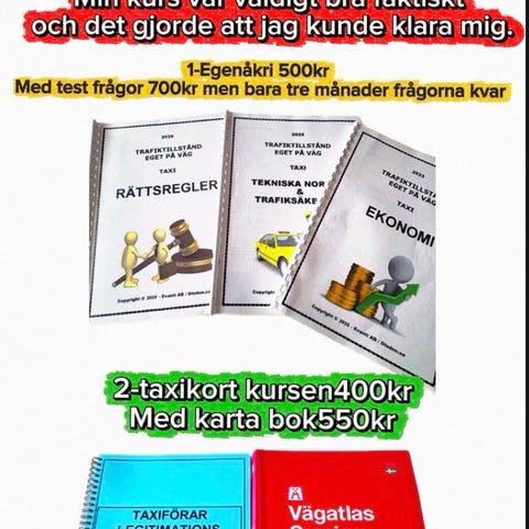Sveriges Trafikutbildares Riksförbund Taxiförarlegitimation lärobok för taxiförarprov. Boken behandlar teori och regler kopplade till taxiförarlegitimation och är avsedd som kurslitteratur för den som förbereder sig för prov hos Transportstyrelsen. Tryckt i häftad/pocketutgåva med illustrerad framsida. Lämplig som kompletterande studiematerial inom övrig kurslitteratur för trafikutbildning.