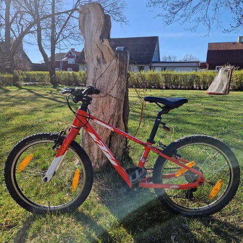 Rock Machine barncykel med 24" hjul mountain bike med 7 växlar. Cykeln har en röd ram med orange detaljer, grovmönstrade däck och V-bromas fram och bak. Utrustad med platt pedaler, styre med handbromsar samt flaskhållare på ramen, stötdämpare på framhjulet. Lämplig som barn- eller juniorcykel för vardagscykling och enklare turer på grus- och skogsvägar.
