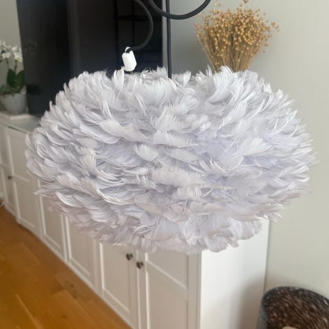 Umage EOS taklampa med skärm i fjäderliknande material i vit ton. Lampan hängs i taket med sladd och takfäste. Ger ett mjukt, varmt ljus och passar till exempel i vardagsrum, sovrum eller barnrum.