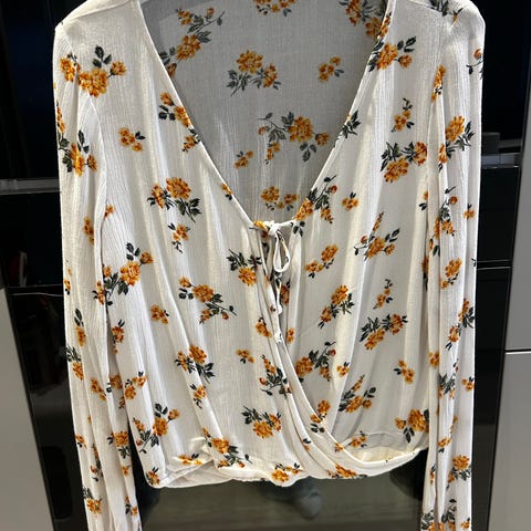 Jennyfer blus i storlek S. Blusen är flerfärgad med ränder i bland annat gult, svart och vitt. Tillverkad i polyester. Modellen har omlottskärning framtill och långa ärmar. Passar som vardags- eller kontorsplagg och kan kombineras med både byxor och kjol.