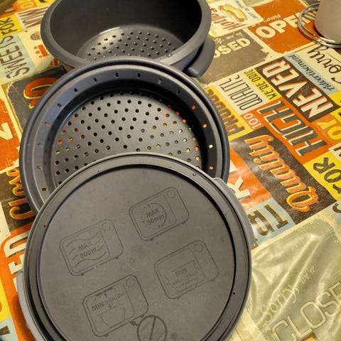 Tupperware ugnsform med lock i svart plast. Oval form med tillhörande lock som sluter tätt. Passar för tillagning och uppvärmning av mat i ugn eller mikrovågsugn enligt tillverkarens anvisningar. Kan även användas för förvaring av mat i kyl eller frys. Tål diskmaskin enligt märkning på undersidan. endast använd ett fåtal gånger.