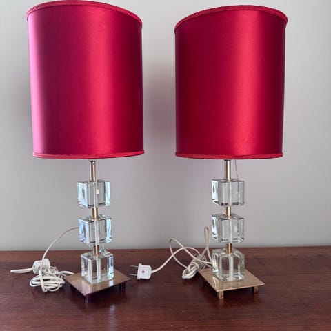 Ett par bordslampor med en sfärisk lampskärm och rödorange fot i space age stil. Mycket fint skick. Rödorange plast och kupor i pressglas. 70-tal. Troligtvis svensk eller tysk design. Unik retro detalj i din inredning!