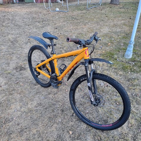 Scott mountainbike med 26" hjul i röd orange färg och 24 växlar. Cykeln har framgaffel med dämpning, skivbroms, V-broms bak o fram och mönstrade däck anpassade för blandad körning. Lämplig som junior- eller ungdomscykel för vardagscykling och enklare terrängkörning.
