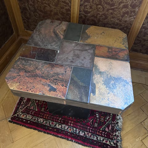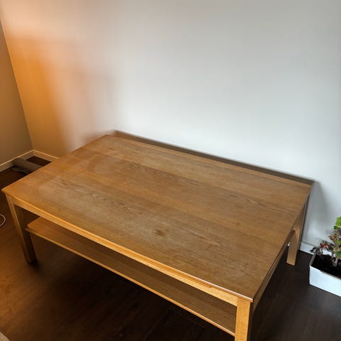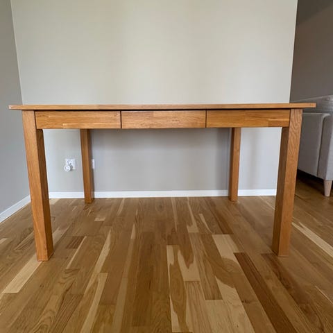 Köpt på Formlagret. Bordet är i fint skick med några mindre patinafläckar. De går att slipa till och olja och bordet blir som nytt igen.