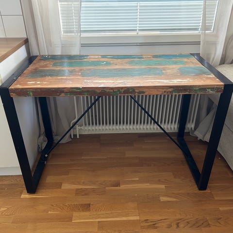Matbord med långsida 1,60 m, kortsida 1,14. Fyra stolar medföljer. Bordet har några märken på ytan, men skulle kunna slipas till lite för att bli som nytt. Bortskänkes på grund av flytt och hämtas i Hässelby gård.