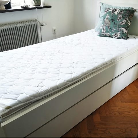 IKEA dagbädd i vit färg med ribbotten och inbyggd förvaring i form av två lådor undertill. Sängramen har höga sidor och ryggstöd med spårpanel, vilket gör att den kan användas både som säng och som soffa under dagen. Passar till standardmadrass i motsvarande storlek. Lådorna ger extra förvaringsutrymme för till exempel sängkläder eller textilier.